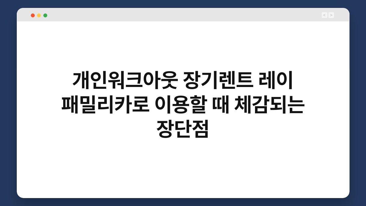 차량을 소유하는 것은 많은 사람들에게 큰 고민거리입니다. 특히, 차량 구매의 부담을 덜고 싶다면 개인워크아웃 장기렌트가 좋은 대안이 될 수 있습니다. 레이 패밀리카를 이용하면 가족 단위의 이동이 편리해지고, 다양한 장점이 있습니다. 하지만 단점도 존재하죠. 이번 글에서는 개인워크아웃 장기렌트의 장단점을 레이 패밀리카를 중심으로 살펴보겠습니다. 황제오토플랜이 제공하는 다양한 서비스와 함께 이 정보를 알아보면 더욱 유익할 것입니다.