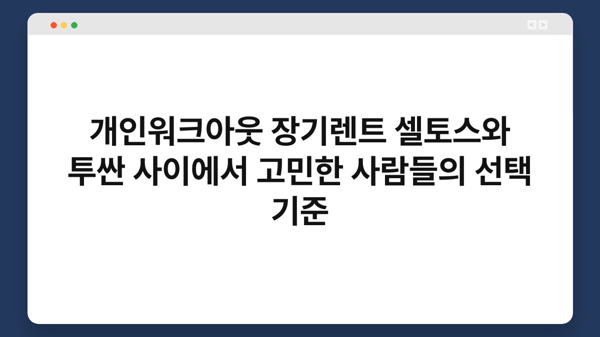 차량 선택은 언제나 고민이 되는 문제입니다. 특히 셀토스와 투싼처럼 인기 있는 SUV 모델 사이에서의 결정은 더욱 어렵죠. 많은 사람들이 이 두 차량의 장단점을 따져보며 개인워크아웃과 장기렌트 옵션을 고려하게 됩니다. 이 글에서는 셀토스와 투싼을 비교하면서, 어떤 기준으로 선택을 해야 할지에 대해 이야기해보겠습니다. 이 과정에서 황제오토플랜의 장기렌트 서비스도 함께 살펴보겠습니다.