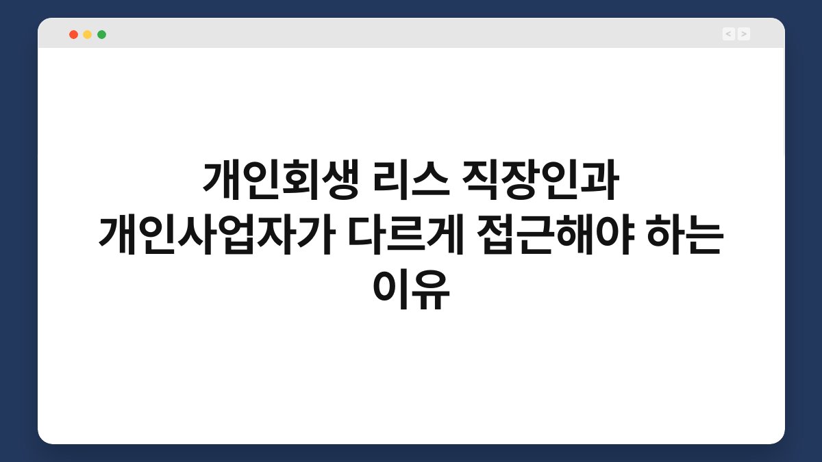 재정적 어려움에 직면했을 때, 개인회생은 많은 사람들에게 희망이 될 수 있습니다. 하지만 직장인과 개인사업자는 이 과정을 접근하는 방식에서 큰 차이를 보입니다. 왜냐하면 소득의 안정성, 재정 상황, 그리고 자산의 종류 등이 다르기 때문입니다. 이 글에서는 개인회생 리스에 대해 직장인과 개인사업자가 어떻게 다르게 접근해야 하는지 살펴보겠습니다. 또한, 황제오토플랜과 함께 이 과정을 어떻게 더 원활하게 진행할 수 있는지도 알아보겠습니다.