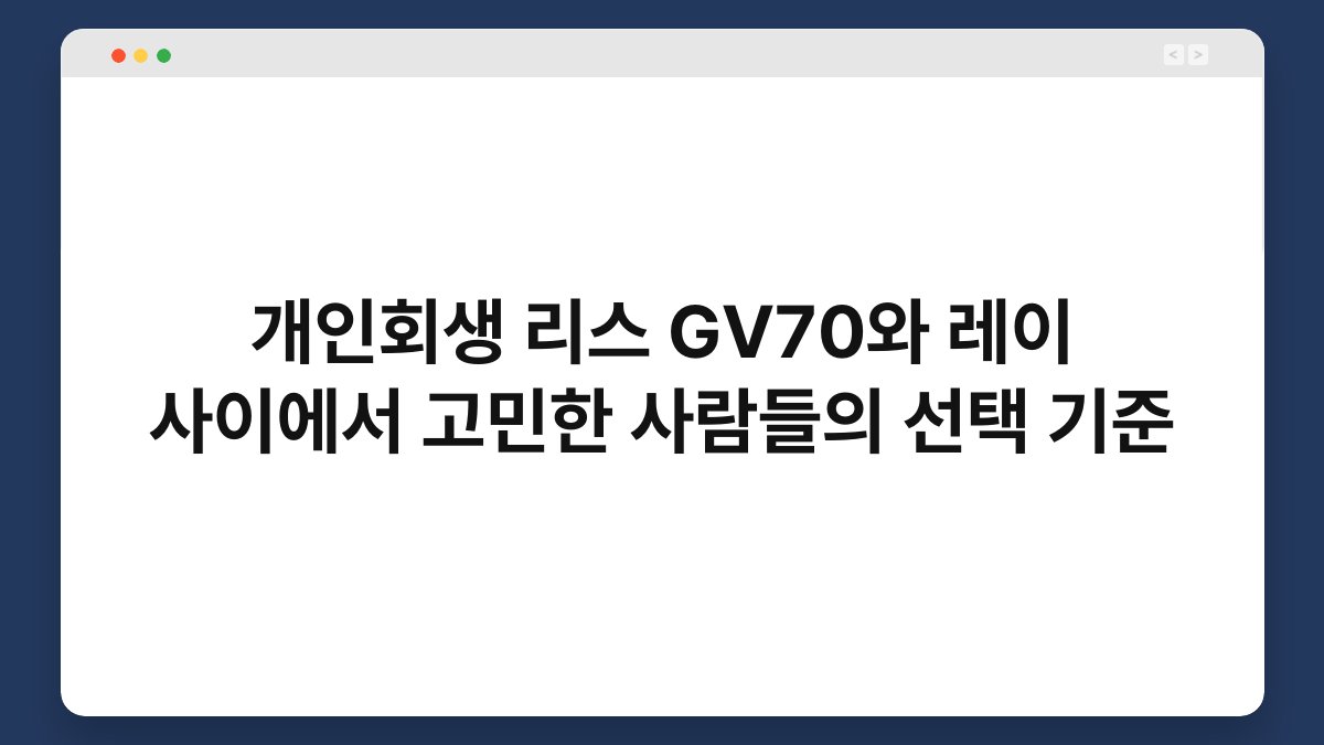 차량 구매는 언제나 고민이 많습니다. 특히 개인회생 중이신 분들은 선택의 폭이 좁아지기 마련이죠. GV70과 레이, 두 차량의 매력과 장단점을 비교하며 어떤 기준으로 선택해야 할지 고민해보겠습니다. 이 글을 통해 나에게 맞는 차량을 찾는 데 도움이 되길 바랍니다. 황제오토플랜과 함께라면 더욱 쉽게 차량을 선택할 수 있습니다.