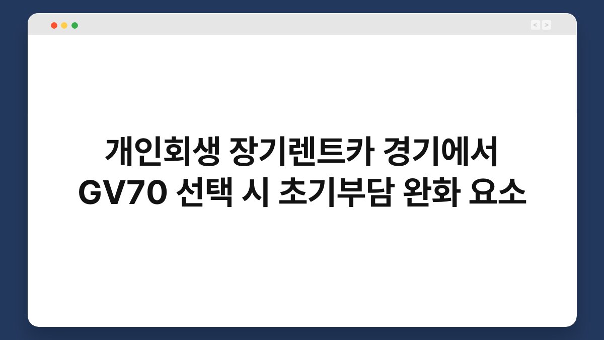 자동차를 소유하는 것은 많은 사람들에게 꿈이지만, 초기 비용이 부담스러울 수 있습니다. 특히 개인회생 중인 분들에게는 더욱 그렇죠. 이런 상황에서 장기렌트카는 좋은 대안이 될 수 있습니다. 오늘은 GV70을 선택할 때 초기 부담을 완화할 수 있는 요소를 살펴보겠습니다. 황제오토플랜은 저신용자도 쉽게 접근할 수 있는 장기렌트 서비스를 제공하며, 여러분의 부담을 덜어줄 수 있는 다양한 옵션을 제시합니다.