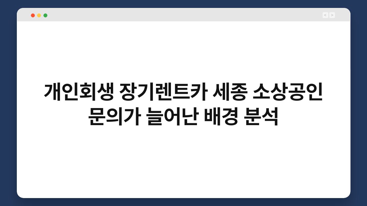 최근 많은 소상공인들이 개인회생과 장기렌트카를 통해 새로운 기회를 모색하고 있습니다. 특히 세종 지역에서 문의가 급증하는 이유는 무엇일까요? 경제적 어려움 속에서도 차량을 필요로 하는 소상공인들이 늘어나면서, 장기렌트카가 대안으로 떠오르고 있습니다. 황제오토플랜은 이러한 흐름을 반영하여 소상공인들에게 최적의 솔루션을 제공하고 있습니다. 이 글에서는 개인회생과 장기렌트카의 관계, 그리고 세종에서의 변화에 대해 자세히 살펴보겠습니다.