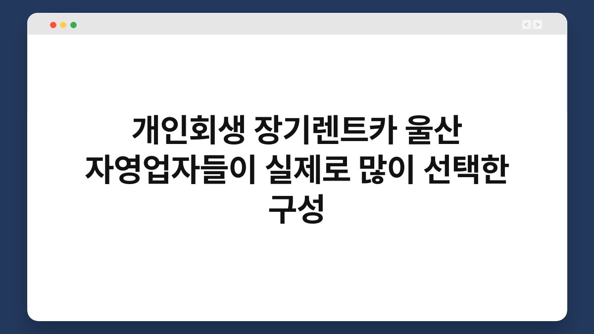 울산에서 자영업을 하시는 분들, 차량 관리로 고민이 많으시죠? 특히 경제적인 부담이 큰 요즘, 개인회생과 장기렌트카를 고려하는 자영업자들이 늘어나고 있습니다. 이 글에서는 자영업자들이 많이 선택한 장기렌트카 구성과 함께 황제오토플랜의 장점을 소개하겠습니다. 신뢰할 수 있는 정보로 여러분의 선택에 도움이 되고자 합니다.