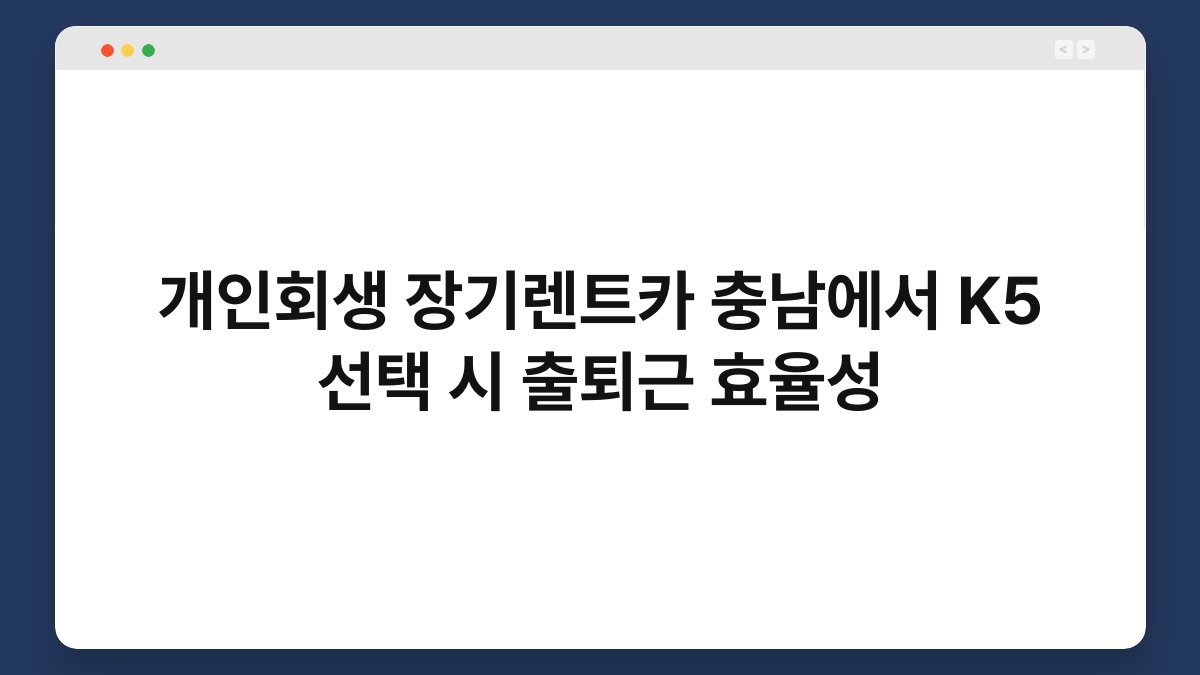출퇴근길, 매일 반복되는 그 시간은 많은 이들에게 스트레스의 원인이 되곤 합니다. 하지만 충남에서 K5를 선택하고 황제오토플랜의 장기렌트카를 이용하면 출퇴근의 효율성을 극대화할 수 있습니다. 이 글에서는 K5의 장점과 함께 개인회생을 고려하는 분들에게도 유용한 정보들을 제공합니다. 특히 장기렌트카를 통해 부담을 줄이고, 편리한 출퇴근을 할 수 있는 방법을 알려드릴게요.