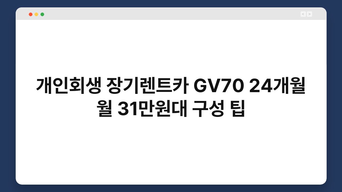 차량을 소유하고 싶지만 재정적인 부담이 걱정되신가요? 개인회생을 통해 신용 문제를 해결하고, GV70을 장기렌트로 이용할 수 있는 방법이 있습니다. 24개월 동안 월 31만원대의 합리적인 비용으로 차량을 소유하는 팁을 소개해 드릴게요. 황제오토플랜과 함께라면 더욱 쉽고 안전하게 차량을 이용할 수 있습니다. 이 글을 통해 장기렌트의 다양한 혜택과 조건을 알아보세요.