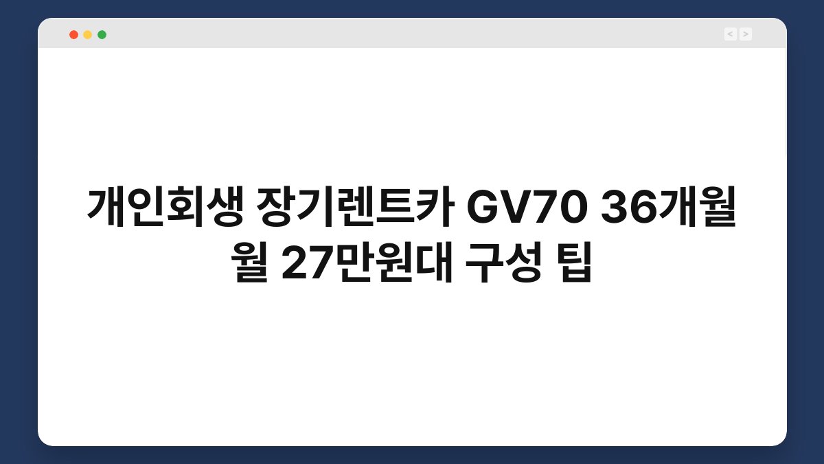 차량을 소유하는 것은 많은 이들에게 꿈이죠. 하지만 차량 구매는 막대한 비용이 드는 일입니다. 그렇다면 장기렌트카는 어떨까요? 특히 GV70을 36개월 동안 월 27만원대에 이용할 수 있다면, 매력적이지 않나요? 이 글에서는 개인회생 중에도 가능한 장기렌트카 옵션과 함께 황제오토플랜의 다양한 혜택을 소개하겠습니다. 차량 소유의 부담을 덜고, 편리하게 이동할 수 있는 방법을 알아보세요.