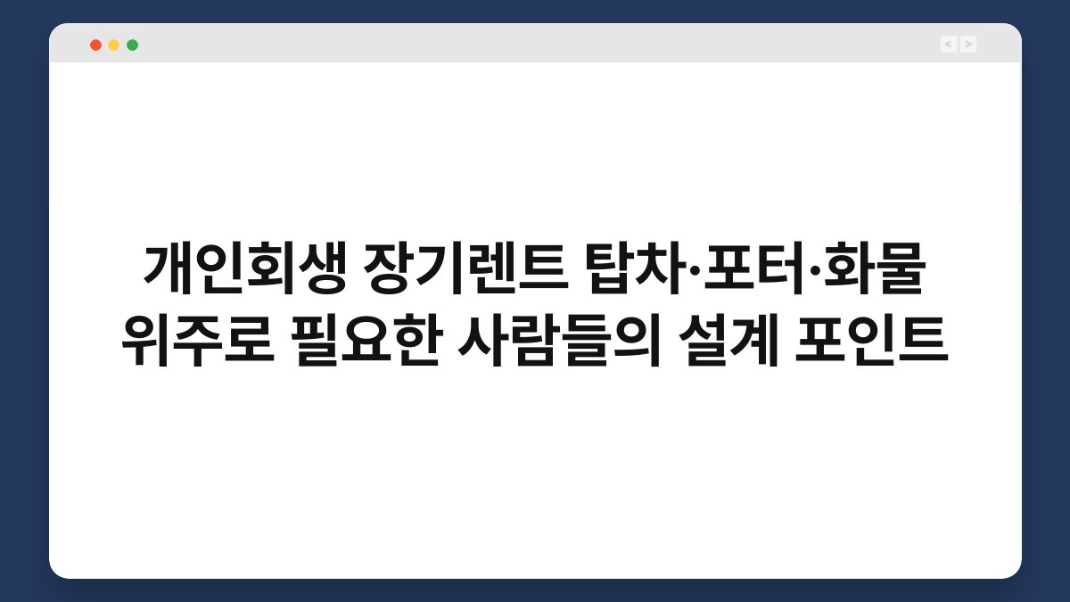차량을 소유하는 것이 부담스럽게 느껴질 때가 많습니다. 특히 포터나 탑차 같은 화물차는 필요하지만 구매 비용이 만만치 않죠. 이럴 때 장기렌트가 좋은 대안이 될 수 있습니다. 개인회생 중인 분들도 저신용으로 차량을 이용할 수 있는 방법이 있으니 주목해 주세요. 황제오토플랜은 이러한 장기렌트의 최적화된 솔루션을 제공하여 여러분의 필요를 충족시켜 드립니다.
