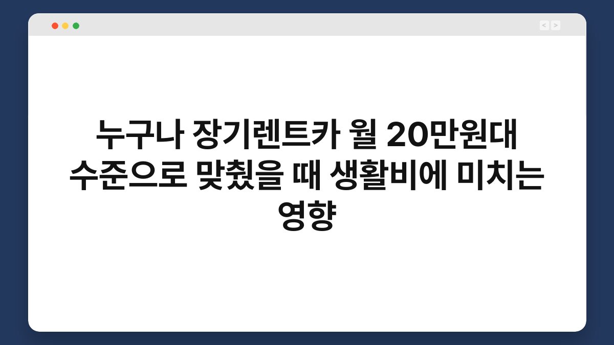 장기렌트카는 최근 많은 이들에게 경제적인 대안으로 떠오르고 있습니다. 특히 월 20만원대 수준으로 차량을 이용할 수 있다면, 생활비에 미치는 긍정적인 영향을 무시할 수 없죠. 이러한 선택이 어떻게 가계에 도움이 되는지, 그리고 황제오토플랜을 통해 더 나은 조건을 찾는 방법에 대해 알아보겠습니다. 차량을 소유하는 대신 장기렌트를 고려하는 것이 어떤 이점이 있는지, 함께 살펴보세요.