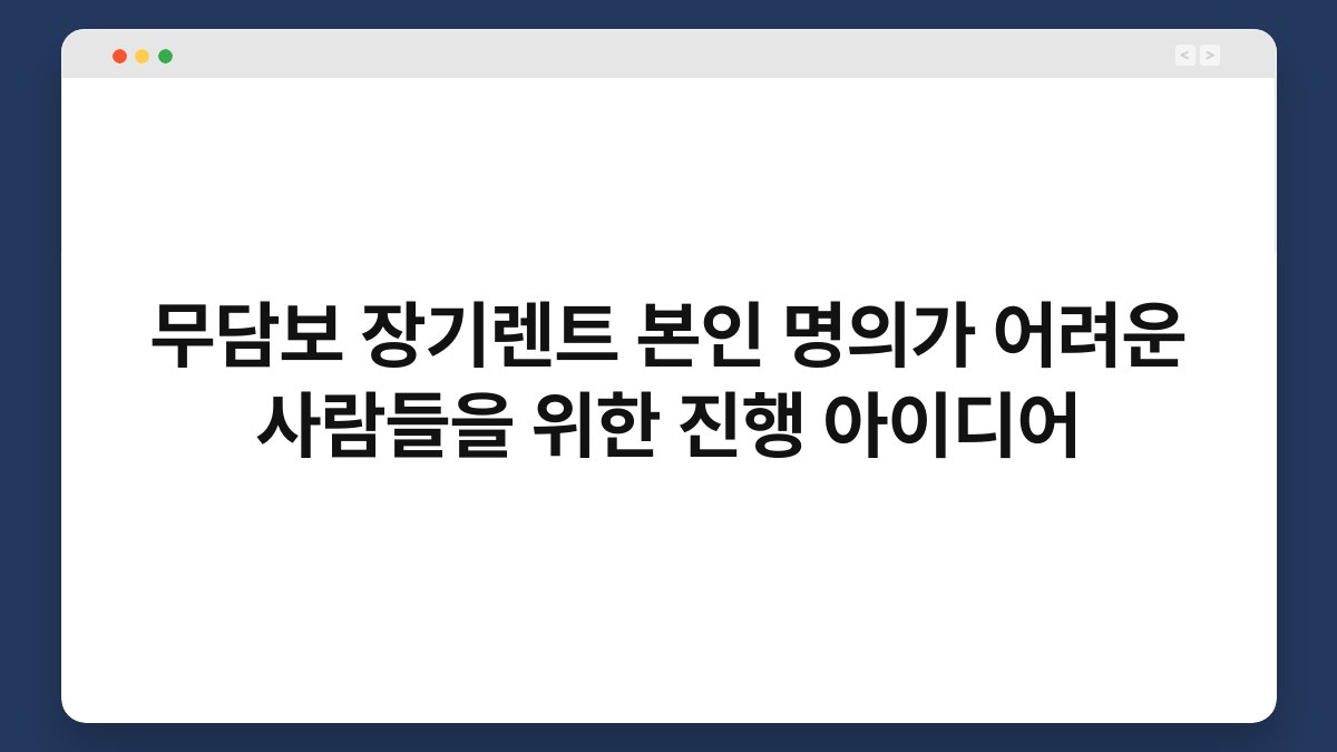 차량을 소유하고 싶지만, 신용 문제로 어려움을 겪고 계신가요? 많은 분들이 무담보 장기렌트를 고려하지만, 본인 명의로 진행하기란 쉽지 않습니다. 하지만 걱정하지 마세요. 황제오토플랜은 저신용자도 접근할 수 있는 다양한 장기렌트 옵션을 제공합니다. 이 글에서는 무담보 장기렌트를 통해 본인 명의가 어려운 분들을 위한 진행 아이디어를 소개하겠습니다. 신뢰할 수 있는 정보를 통해 문제를 해결하는 데 도움을 드리겠습니다.