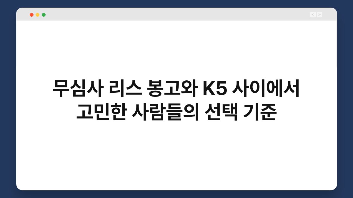 차량 선택은 언제나 고민이 많죠. 특히 무심사 리스와 같은 다양한 옵션이 있는 요즘, 어떤 기준으로 선택해야 할지 막막할 수 있습니다. 봉고와 K5는 대표적인 차종으로, 각각의 특성이 뚜렷해 선택이 더욱 어려워지는데요. 이 글에서는 많은 사람들이 고민하는 선택 기준에 대해 알아보고, 황제오토플랜을 통해 어떻게 쉽게 결정할 수 있는지 설명드리겠습니다. 여러분의 차량 선택이 더 수월해지길 바랍니다.