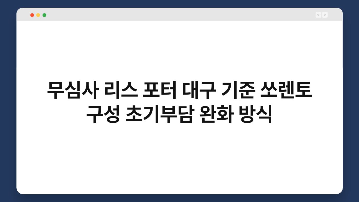 차량을 구매할 때 많은 분들이 고민하는 것이 초기 부담입니다. 특히, 대구에서 쏘렌토와 같은 인기 모델을 선택할 때는 더욱 그렇죠. 이럴 때 무심사 리스 포터와 같은 옵션이 큰 도움이 될 수 있습니다. 초기 부담을 완화하는 방식으로 차량을 소유할 수 있는 방법을 알아보겠습니다. 황제오토플랜의 다양한 서비스와 함께하면 더 유리하게 차량을 이용할 수 있습니다.