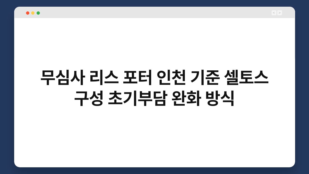 차량 구매를 고민하는 분들이라면, 초기 부담을 줄이는 다양한 방법에 대해 알고 싶으실 겁니다. 특히 인천에서 무심사 리스를 통해 셀토스를 구입하는 방법은 많은 이들에게 주목받고 있습니다. 초기 부담 완화 방식으로 무심사 리스는 신용 등급이 낮은 분들도 쉽게 접근할 수 있도록 도와줍니다. 특히 황제오토플랜과 같은 전문 업체를 통해 더욱 유리한 조건으로 차량을 이용할 수 있는 기회를 제공합니다. 이 글에서는 무심사 리스와 셀토스에 대한 정보, 그리고 황제오토플랜의 장점까지 상세히 알아보겠습니다.