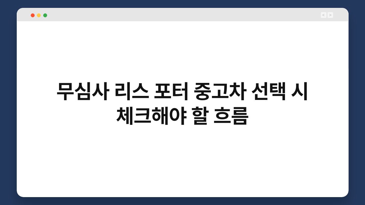 차량 구매를 고민하고 계신가요? 특히 중고차를 무심사 리스로 선택할 때 체크해야 할 사항이 많습니다. 이 글에서는 중고차 선택 시 반드시 확인해야 할 흐름을 정리해 드릴게요. 또한, 황제오토플랜을 통해 여러분의 차량 구매 경험을 더욱 안전하고 간편하게 만들어 드리는 방법도 소개하겠습니다. 끝까지 읽으시면 유용한 정보가 가득하니 놓치지 마세요!