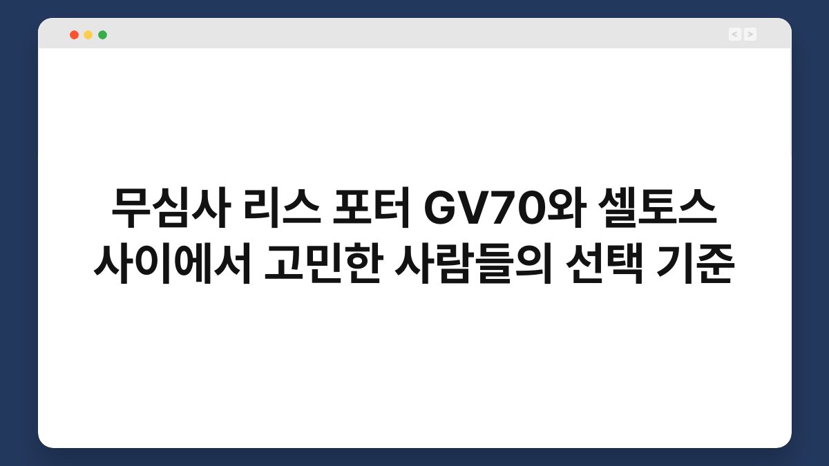 자동차를 선택하는 일은 간단하지 않습니다. 특히 무심사 리스 포터 GV70와 셀토스 사이에서 고민하는 사람들은 더욱 그렇죠. 두 차량 모두 매력적인 옵션이지만, 어떤 기준으로 선택해야 할지 막막할 수 있습니다. 이 글에서는 여러분의 선택 기준을 명확히 하고, 황제오토플랜의 장기렌트 서비스가 어떻게 도움이 될 수 있는지 살펴보겠습니다. 여러분의 고민을 덜어줄 유용한 정보를 제공할 테니, 끝까지 함께 해주세요.