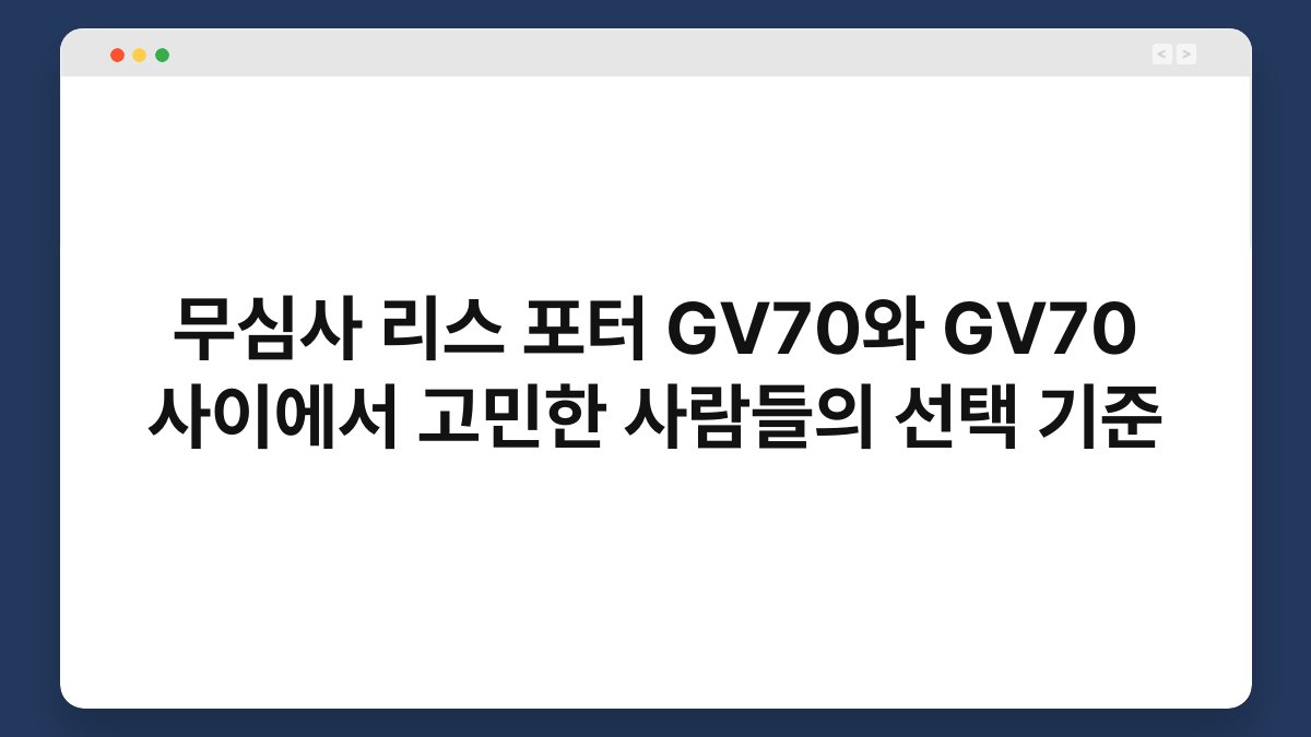 자동차 구매를 고민하는 분들, 특히 무심사 리스 포터 GV70와 GV70 사이에서 선택의 기로에 서 계신다면 주목해 주세요. 이 글에서는 두 모델의 특징과 장단점을 비교하며, 어떤 기준으로 선택해야 할지에 대한 유용한 정보를 제공할 것입니다. 특히, 황제오토플랜의 장기렌트 서비스와 함께 알아보면 더 많은 도움이 될 것입니다. 차량 선택에 대한 고민이 해소될 수 있도록 도와드릴게요.