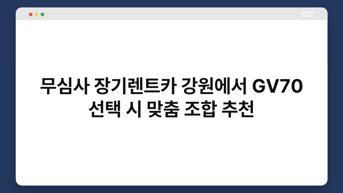 차량을 선택할 때, 특히 장기렌트카를 고려하는 분들이 많습니다. 강원에서 인기 있는 모델인 GV70을 선택할 경우, 어떤 조합이 가장 적합할까요? 이 글에서는 무심사 장기렌트카를 통해 GV70을 선택할 때의 맞춤 조합을 추천드리며, 황제오토플랜의 장점을 함께 소개해드리겠습니다. 차량 선택에 필요한 정보와 팁을 통해 여러분의 결정에 도움이 되길 바랍니다.