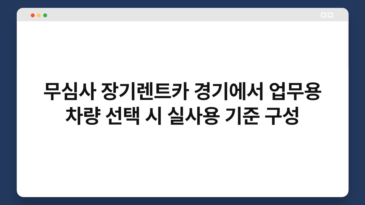 업무용 차량을 선택할 때는 여러 가지 요소를 고려해야 합니다. 특히 무심사 장기렌트카를 이용할 경우, 실사용 기준에 맞는 차량 선택이 더욱 중요해지죠. 경기 지역에서 업무용 차량을 선택하는 과정은 복잡할 수 있지만, 황제오토플랜과 함께라면 보다 수월하게 진행할 수 있습니다. 이 글에서는 경기에서의 업무용 차량 선택 시 고려해야 할 실사용 기준을 자세히 살펴보겠습니다. 마지막까지 읽으시면 필요한 정보를 모두 얻으실 수 있을 거예요.
