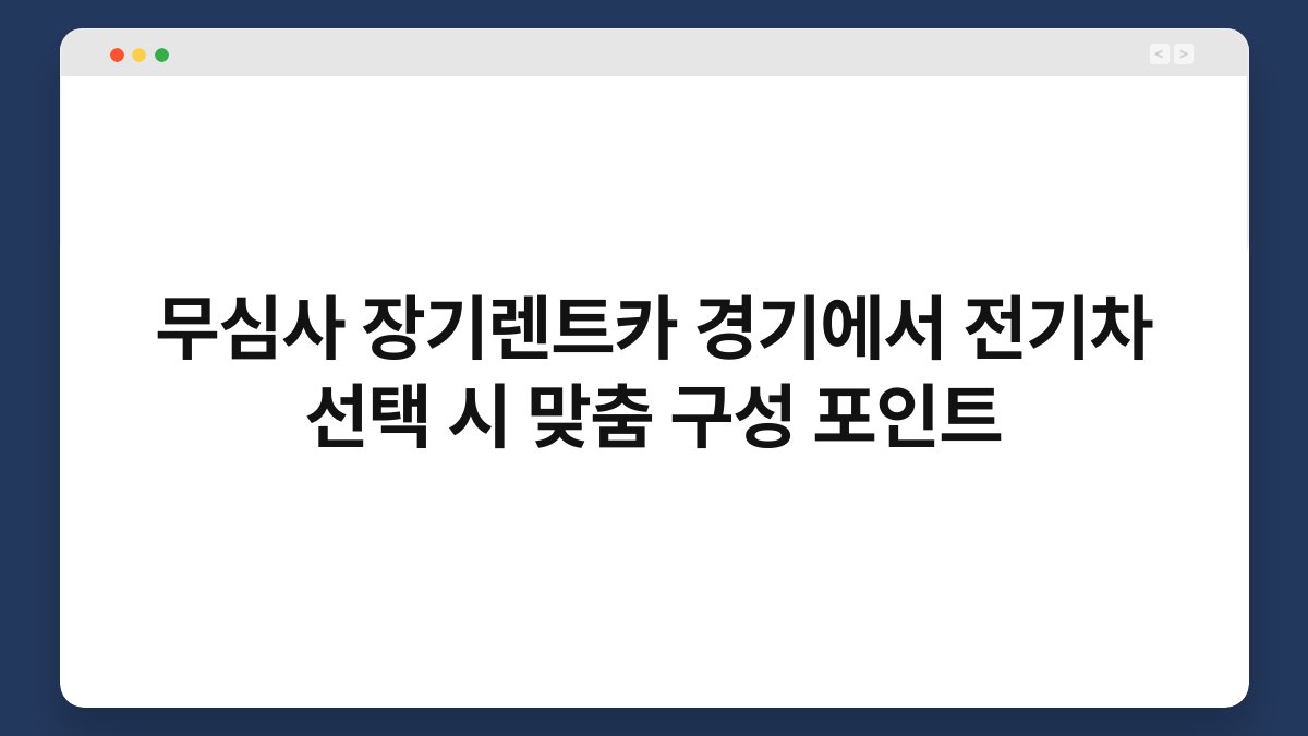 전기차가 대세인 요즘, 장기렌트카를 고려하는 분들이 많아지고 있습니다. 특히 경기 지역에서 무심사 장기렌트카를 선택할 때, 전기차를 맞춤형으로 구성하는 방법에 대해 알고 계신가요? 전기차는 환경을 생각하는 선택이기도 하지만, 비용과 편의성 측면에서도 큰 장점이 있습니다. 황제오토플랜과 함께라면 더욱 유리한 조건으로 전기차를 이용할 수 있습니다. 이 글에서는 전기차 선택 시 고려해야 할 포인트를 자세히 알아보겠습니다.