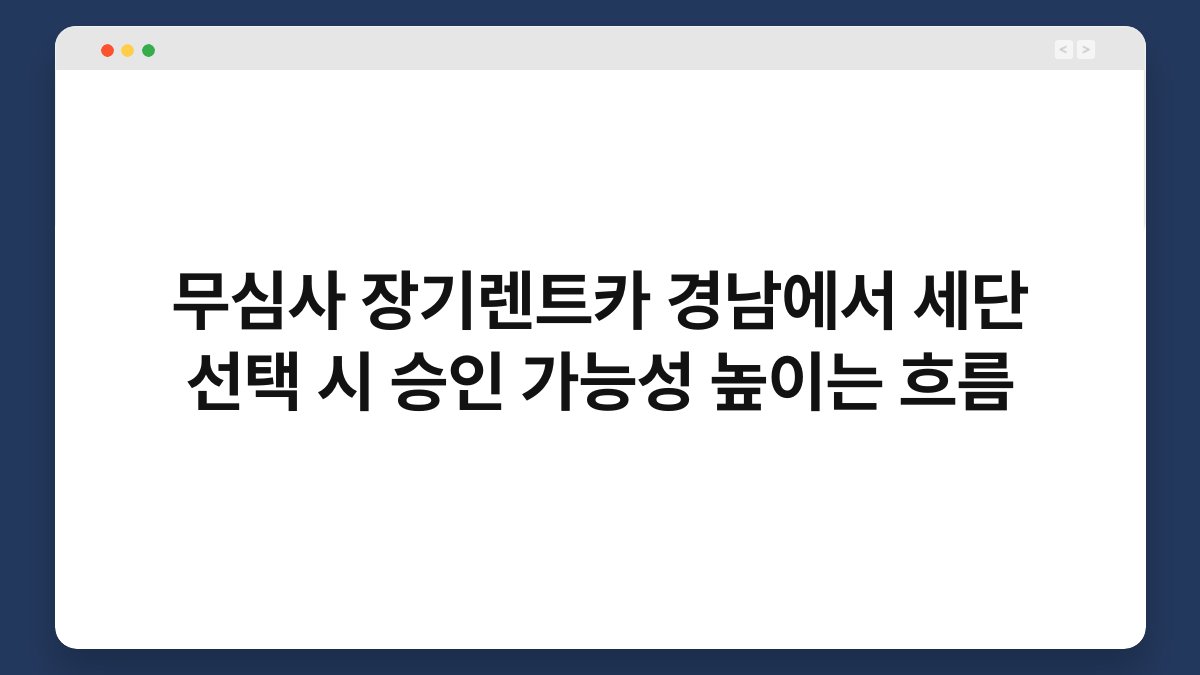 운전의 자유로움을 느끼고 싶지만, 신용 문제로 고민 중이신가요? 경남에서 무심사 장기렌트카를 이용하면 세단을 손쉽게 선택할 수 있습니다. 특히 황제오토플랜과 함께라면 승인 가능성을 높이는 다양한 방법을 알 수 있어요. 이 글에서는 경남에서 세단을 선택할 때 유용한 정보와 황제오토플랜의 장점을 소개해 드리겠습니다. 끝까지 읽어보시면, 차량 선택이 훨씬 수월해질 거예요.