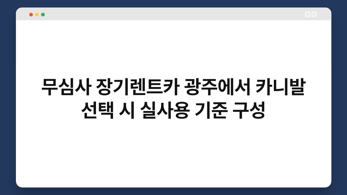 광주에서 무심사 장기렌트카를 찾고 계신가요? 특히 카니발을 선택할 때 실사용 기준을 고려하는 것이 중요합니다. 오늘은 카니발의 장점과 황제오토플랜의 서비스를 통해 어떻게 합리적인 선택을 할 수 있는지 알아보겠습니다. 장기렌트는 단순한 차량 이용을 넘어, 생활의 편리함을 더해주는 좋은 방법이죠. 이 글을 통해 실용적인 정보를 얻으시길 바랍니다.