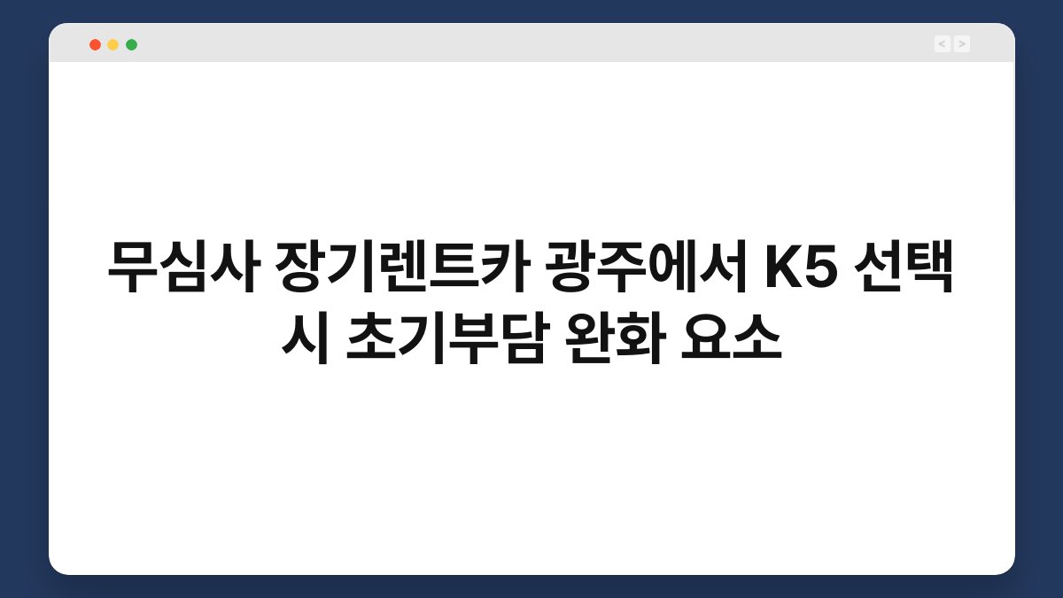 차량을 소유하고 싶지만 초기 비용이 부담스러워 고민하고 계신가요? 특히 광주에서 K5를 선택할 경우, 무심사 장기렌트카의 혜택이 큰 도움이 될 수 있습니다. 초기 부담을 완화하는 다양한 요소들이 있어, 여러분의 선택에 실질적인 도움을 줄 수 있습니다. 황제오토플랜의 장기렌트 서비스는 이러한 고민을 덜어줄 수 있는 최적의 해결책이 될 것입니다. 이 글에서는 무심사 장기렌트카의 장점과 K5 선택 시 고려해야 할 사항을 자세히 설명드리겠습니다.