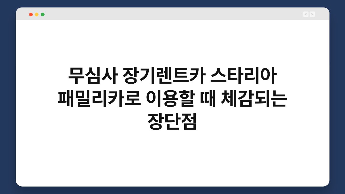 가족 여행이나 장기적인 이동이 필요할 때, 무심사 장기렌트카를 고려하는 분들이 많습니다. 특히 스타리아 패밀리카는 넓은 공간과 편안한 승차감으로 많은 사랑을 받고 있는데요. 이번 글에서는 스타리아 패밀리카를 무심사 장기렌트카로 이용할 때의 장단점을 살펴보겠습니다. 황제오토플랜과 함께라면 더욱 유용한 정보가 될 것입니다. 이 기회를 통해 장기렌트의 매력을 알아보세요!