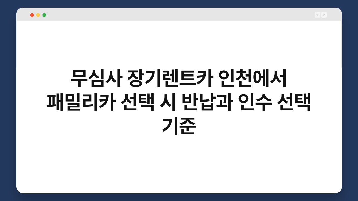 인천에서 패밀리카를 선택할 때, 무심사 장기렌트카의 장점과 반납 및 인수 기준에 대해 고민해본 적 있으신가요? 많은 분들이 차량 이용의 편리함을 위해 장기렌트를 선택하지만, 어떤 기준으로 차량을 선택해야 하는지에 대한 정보는 부족한 경우가 많습니다. 특히 인천 지역에서는 다양한 차량 옵션이 제공되므로, 선택의 폭이 넓어지게 됩니다. 황제오토플랜과 함께라면 더욱 신뢰할 수 있는 선택이 가능하니, 이 글을 통해 필요한 정보를 얻어보세요.