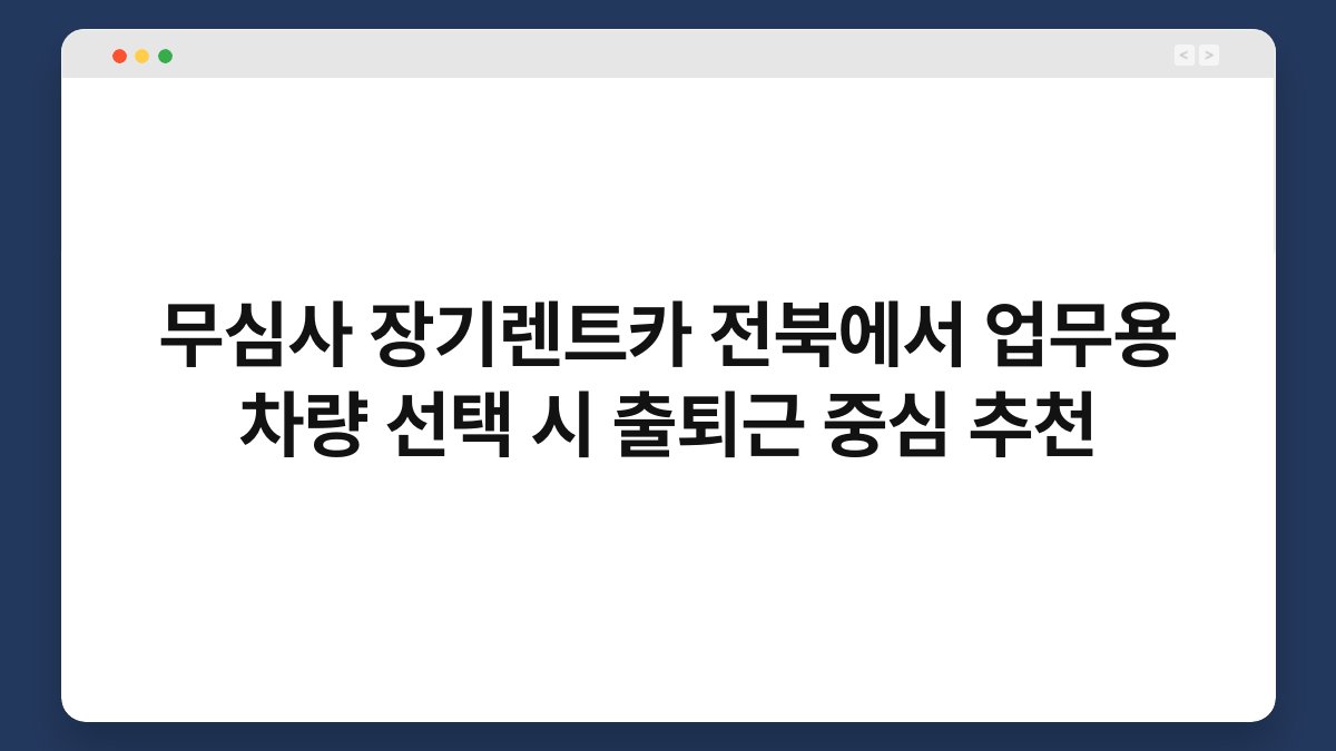 출퇴근용 차량을 선택할 때, 무심사 장기렌트카는 매우 유용한 옵션입니다. 특히 전북 지역에서 업무용 차량을 찾고 있다면, 비용과 편리함을 동시에 고려해야 합니다. 황제오토플랜은 저신용자도 부담 없이 차량을 이용할 수 있는 다양한 선택지를 제공합니다. 이 글에서는 전북에서 출퇴근 중심의 차량 선택 시 고려해야 할 사항과 황제오토플랜의 장점을 자세히 살펴보겠습니다.