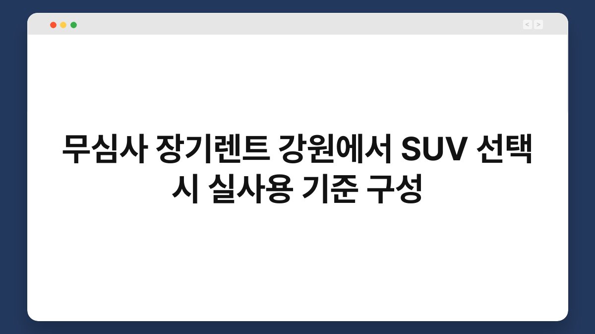 SUV를 선택할 때, 특히 강원에서 무심사 장기렌트를 고려하고 계신가요? 다양한 모델과 옵션이 많아 선택이 어려울 수 있지만, 실사용 기준을 바탕으로 신중하게 결정하면 만족스러운 결과를 얻을 수 있습니다. 이 글에서는 SUV 선택 시 고려해야 할 실사용 기준과 황제오토플랜의 장기렌트 서비스를 통해 최적의 선택을 할 수 있는 방법을 안내해 드리겠습니다. 차량 선택의 기준을 명확히 하고, 무심사 장기렌트의 장점을 통해 경제적이고 편리한 자동차 이용 방법을 알아보세요.