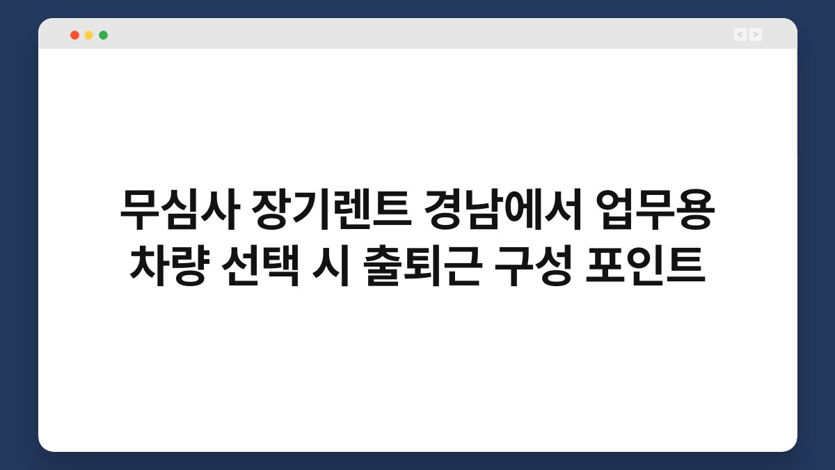 업무용 차량을 선택할 때, 특히 경남 지역에서 무심사 장기렌트를 고려하는 분들이 많습니다. 출퇴근을 위한 차량은 단순한 이동 수단이 아니라, 업무의 효율성을 높이는 중요한 요소입니다. 어떤 차량이 적합할지 고민하는 여러분을 위해, 출퇴근 구성 포인트와 함께 황제오토플랜의 다양한 장기렌트 옵션을 소개해 드리겠습니다. 이 글을 통해 최적의 차량 선택에 도움이 되길 바랍니다.