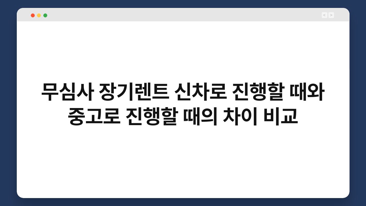 자동차를 소유하는 방법에는 여러 가지가 있습니다. 그중에서도 무심사 장기렌트는 많은 분들에게 매력적인 선택이 되고 있습니다. 신차와 중고차로 진행할 때의 차이를 비교해보면, 각자의 장단점이 뚜렷하게 드러납니다. 이 글에서는 무심사 장기렌트를 신차와 중고차로 진행할 때의 차이를 살펴보며, 황제오토플랜의 장점도 함께 소개하겠습니다. 자동차를 어떻게 소유할지 고민하고 계신다면, 끝까지 읽어보세요!