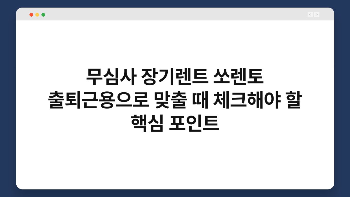 출퇴근용 차량을 선택하는 일은 생각보다 간단하지 않습니다. 특히 무심사 장기렌트로 쏘렌토를 고려하고 계신다면 체크해야 할 핵심 포인트가 있습니다. 이 글에서는 쏘렌토의 장점과 함께 황제오토플랜을 통한 장기렌트의 유용성을 소개해드리겠습니다. 여러분의 편리한 출퇴근을 위한 차량 선택에 도움이 되길 바랍니다.