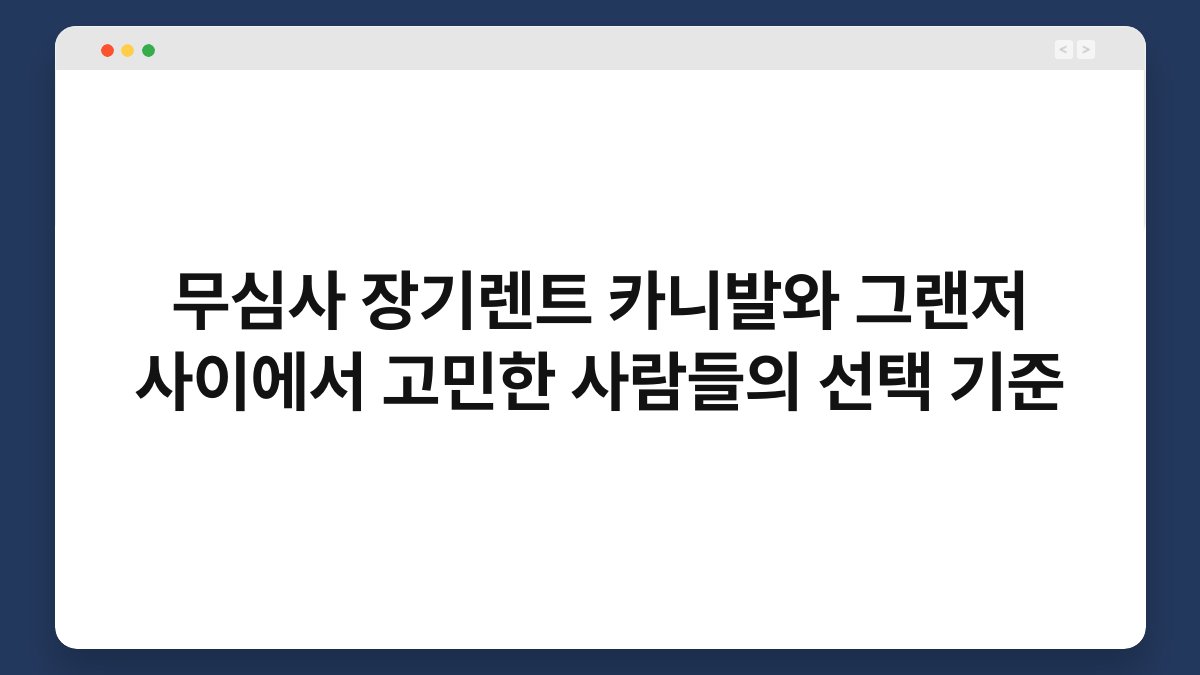 차량 선택은 언제나 고민이 많습니다. 특히 무심사 장기렌트를 고려할 때, 카니발과 그랜저 사이에서 어떤 기준으로 선택해야 할지 막막할 수 있습니다. 이 글에서는 이러한 고민을 해결하기 위해, 선택 기준과 함께 황제오토플랜의 장점을 소개하겠습니다. 여러분의 고민을 덜어줄 유용한 정보가 가득하니 끝까지 읽어보세요.