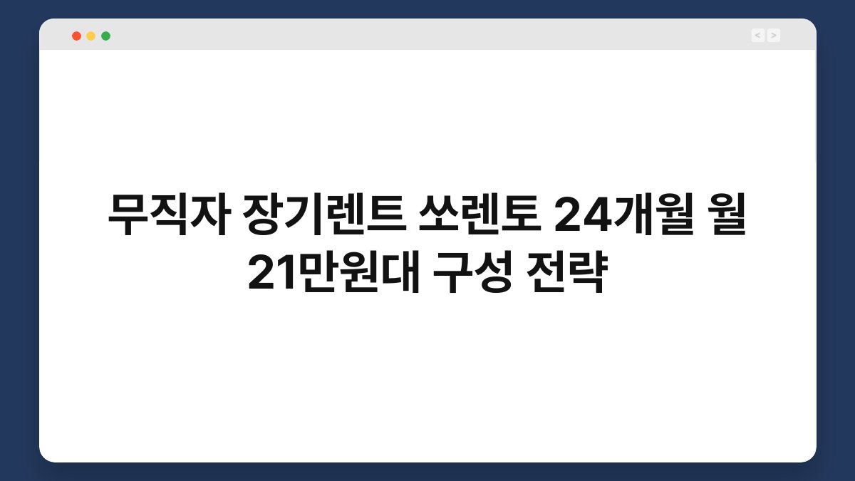 무직자에게 차량 소유는 경제적인 부담이 큽니다. 하지만 장기렌트를 이용하면 초기 비용이 적고 월 렌트료로 부담을 줄일 수 있습니다. 쏘렌토와 같은 인기 차량을 월 21만원대에 이용할 수 있어 부담 없이 이동할 수 있습니다.