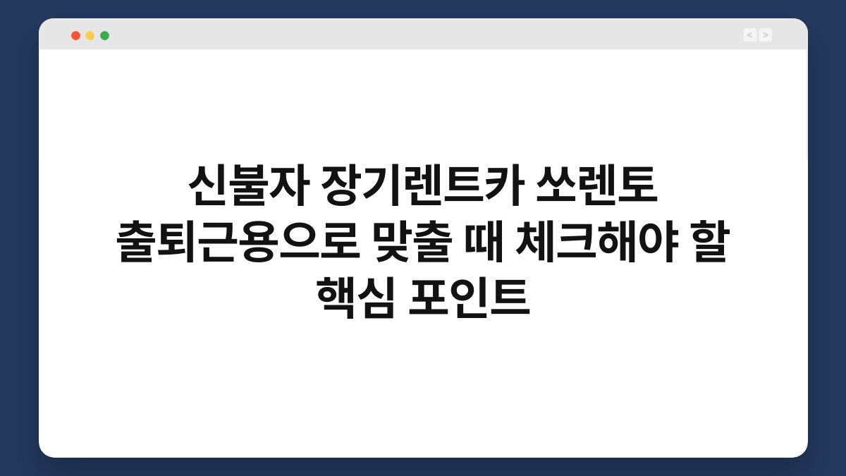 신불자 분들이 장기렌트카를 이용해 출퇴근을 고려할 때, 쏘렌토는 매력적인 선택이 될 수 있습니다. 하지만 신용 등급이 낮은 상황에서는 더욱 신중해야 합니다. 이번 글에서는 신불자 장기렌트카 쏘렌토를 출퇴근용으로 맞출 때 체크해야 할 핵심 포인트를 살펴보겠습니다. 황제오토플랜과 함께라면 더욱 안전하고 유리한 조건으로 차량을 이용할 수 있습니다. 그럼 어떤 점들을 반드시 고려해야 할까요?