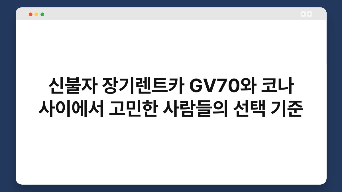 차량을 선택할 때 가장 먼저 고려해야 할 사항은 개인의 용도와 예산입니다. GV70은 고급스러운 주행 경험을 원하는 분들에게 적합하고, 코나는 경제적인 운전을 원하는 분들에게 맞습니다.