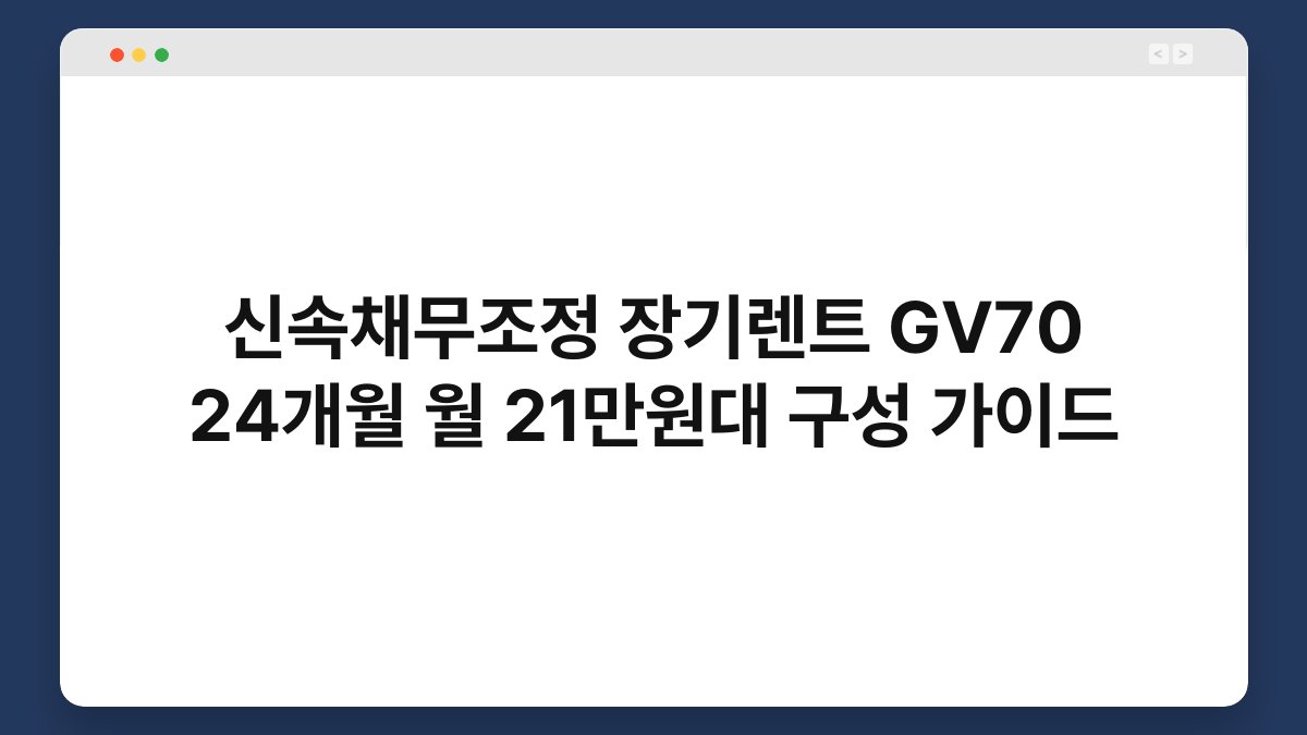 최근 신속채무조정 제도가 많은 사람들에게 주목받고 있습니다. 특히 차량 구매나 렌트에 대한 부담을 덜어주기 위해 다양한 옵션이 마련되고 있죠. 오늘은 GV70을 24개월 동안 월 21만원대에 장기렌트할 수 있는 방법을 소개해드릴게요. 황제오토플랜을 통해 이 과정을 더욱 간편하게 진행할 수 있습니다. 함께 알아보시죠!