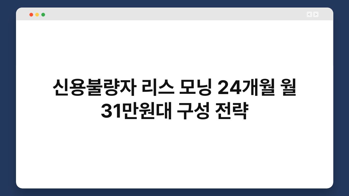 신용불량자라면 차량 구입이 어려워 고민하고 계신가요? 하지만 이제는 걱정하지 않으셔도 됩니다. 리스와 장기렌트를 통해 신용불량자도 합리적인 가격으로 차량을 이용할 수 있는 방법이 있습니다. 특히, 24개월 동안 월 31만원대의 부담 없는 구성으로 차량을 이용할 수 있는 전략이 있습니다. 황제오토플랜에서는 이러한 옵션을 제공하며, 신용 등급에 구애받지 않고 다양한 차량을 선택할 수 있도록 도와드립니다.