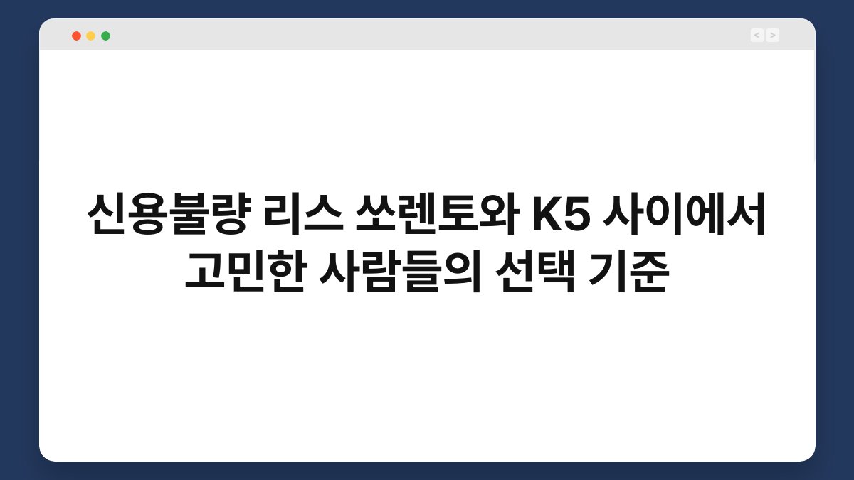 신용불량 상태에서 자동차를 구매하는 것은 쉽지 않은 결정입니다. 특히 쏘렌토와 K5와 같은 인기 모델 사이에서 고민하는 분들이 많습니다. 어떤 선택이 더 나을지, 각 모델의 장단점은 무엇인지 궁금하시죠? 이 글에서는 신용불량자들이 쏘렌토와 K5 사이에서 선택할 때 고려해야 할 기준을 살펴보겠습니다. 또한 황제오토플랜과 함께 신용불량자에게 적합한 리스 및 장기렌트 정보를 제공하겠습니다.