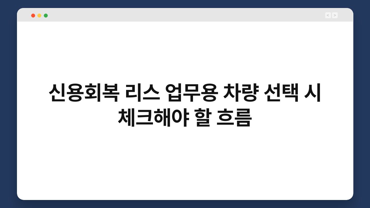 신용회복을 위한 리스, 업무용 차량 선택 시 체크해야 할 흐름에 대해 이야기해볼까요? 많은 분들이 차량을 선택할 때 고민하는 부분이 바로 신용 상태와 관련된 사항입니다. 특히 신용회복 중인 분들은 어떤 차량을 선택해야 할지 막막할 수 있습니다. 황제오토플랜은 이러한 고민을 덜어줄 수 있는 다양한 정보를 제공하고 있습니다. 이 글에서는 신용회복과 관련된 리스, 업무용 차량 선택 시 꼭 체크해야 할 흐름을 살펴보겠습니다.