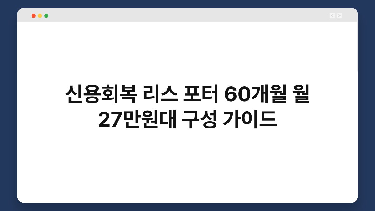 신용회복 리스는 저신용자에게 유리한 조건을 제공합니다. 월 27만원대의 부담 없는 가격으로 60개월 동안 차량을 이용할 수 있어요. 차를 소유하는 부담 없이 필요한 기간 동안 차량을 이용할 수 있는 점이 큰 장점입니다.