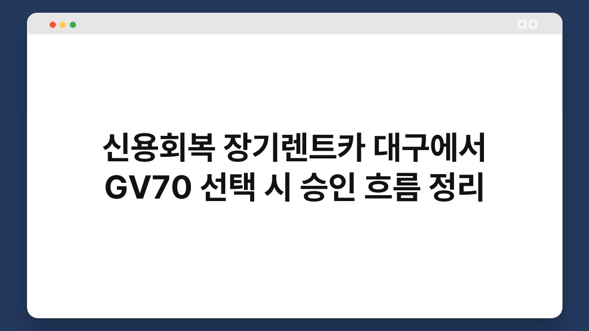 신용 회복을 위해 장기 렌트카를 고려하는 분들이 많아지고 있습니다. 특히 대구에서 GV70을 선택할 때, 어떤 승인 흐름이 있는지 궁금하신가요? 이 글에서는 신용 회복을 위한 장기 렌트카의 장점과 함께, GV70 선택 시의 승인 과정에 대해 자세히 설명드리겠습니다. 황제오토플랜의 전문적인 상담을 통해 보다 쉽게 차량을 이용할 수 있는 방법을 알려드릴게요. 끝까지 함께 해주세요!