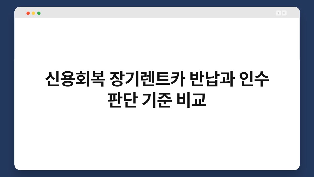 신용회복을 목표로 하는 분들이 장기렌트카를 선택할 때는 여러 요소를 고려해야 합니다. 신용등급이 낮은 경우, 대출이나 할부 구매가 어려워 장기렌트카가 대안이 될 수 있습니다. 이때, 반납과 인수의 판단 기준은 매우 중요합니다. 반납 시에는 차량의 상태와 잔존가치 등을 확인해야 하며, 인수할 경우에는 차량의 유지비와 보험료를 고려해야 합니다.