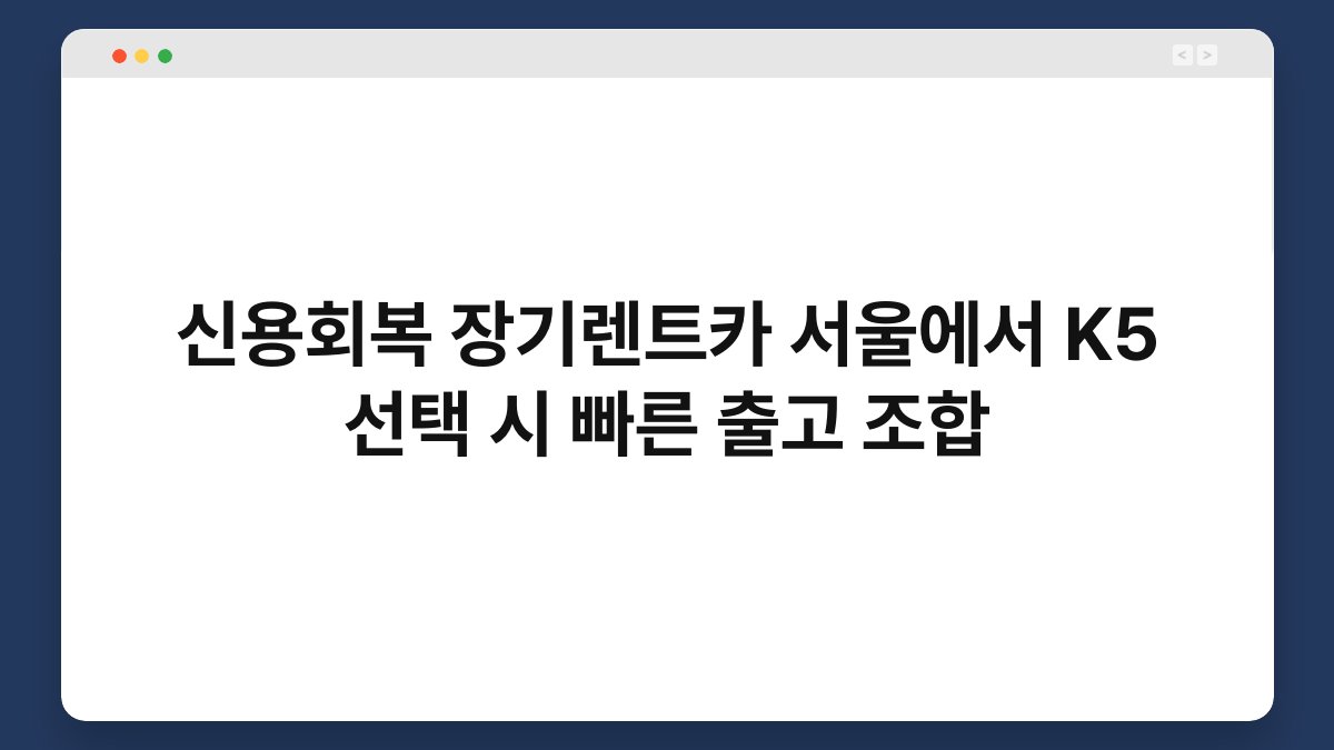신용회복을 원하는 분들은 대출이나 구매가 어려운 경우가 많습니다. 이럴 땐 신용회복 장기렌트카가 좋은 대안이 될 수 있습니다. 저신용자도 차량을 이용할 수 있는 기회를 제공하므로, 이동의 자유를 누릴 수 있습니다. 특히 K5와 같은 인기 모델은 빠른 출고가 가능해 더욱 매력적입니다.