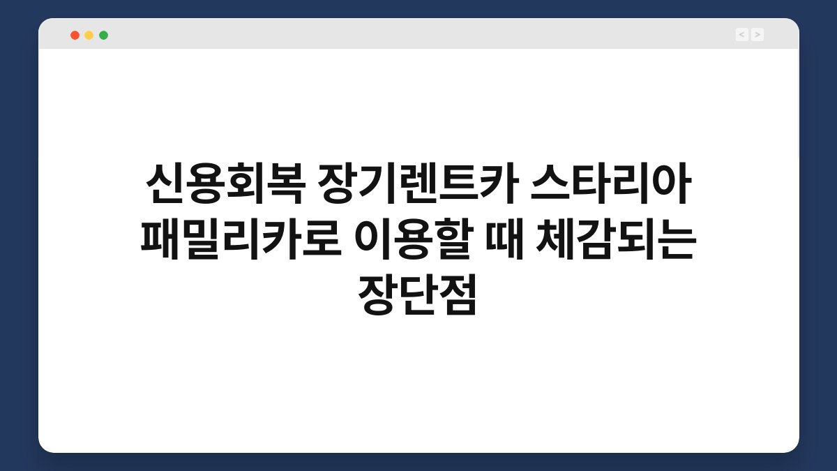 신용회복을 위해 장기렌트카를 고려하는 분들이 많아지고 있습니다. 특히 스타리아와 같은 패밀리카는 가족 단위의 이동에 적합해 인기를 끌고 있죠. 하지만 장기렌트를 선택할 때는 여러 장단점이 존재합니다. 이 글에서는 스타리아를 장기렌트카로 이용할 때 어떤 체감되는 장단점이 있는지 살펴보겠습니다. 황제오토플랜을 통해 신용회복과 함께 차량 이용의 혜택을 누릴 수 있는 방법도 함께 소개할게요.