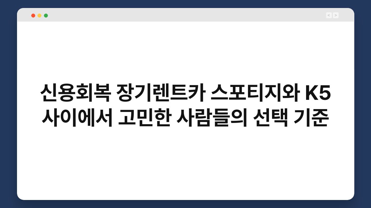 신용회복을 위해 장기렌트카를 고려하는 분들, 어떤 선택을 해야 할지 고민이 많으시죠? 특히 스포티지와 K5는 많은 이들이 선호하는 차량으로, 각자의 매력이 뚜렷합니다. 이 글에서는 두 차량의 특징과 장단점을 비교하며, 어떤 기준으로 선택할 수 있는지 알아보겠습니다. 황제오토플랜과 함께라면 신용 회복에 도움이 되는 장기렌트카를 더욱 쉽게 찾아볼 수 있습니다. 여러분의 선택이 더 쉽게 이루어질 수 있도록 정보를 제공해 드릴게요.