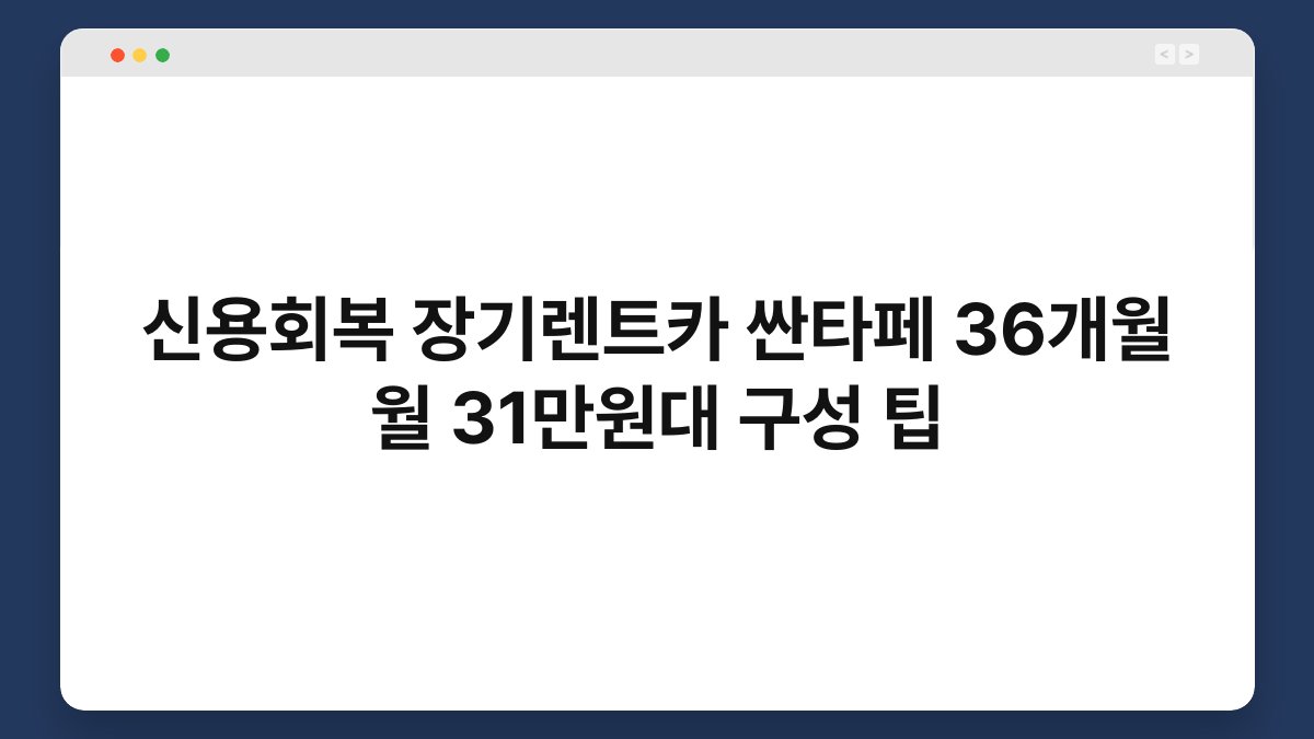 자동차 구매는 많은 사람에게 큰 고민거리죠? 특히 신용이 좋지 않은 경우, 차량을 소유하는 것이 더욱 어렵게 느껴질 수 있습니다. 하지만 걱정하지 마세요! 신용회복을 위한 장기렌트카 옵션이 있습니다. 싼타페와 같은 인기 차종을 36개월 동안 월 31만원대에 이용할 수 있는 방법도 있답니다. 황제오토플랜을 통해 이러한 차량 렌트의 혜택을 누려보세요.