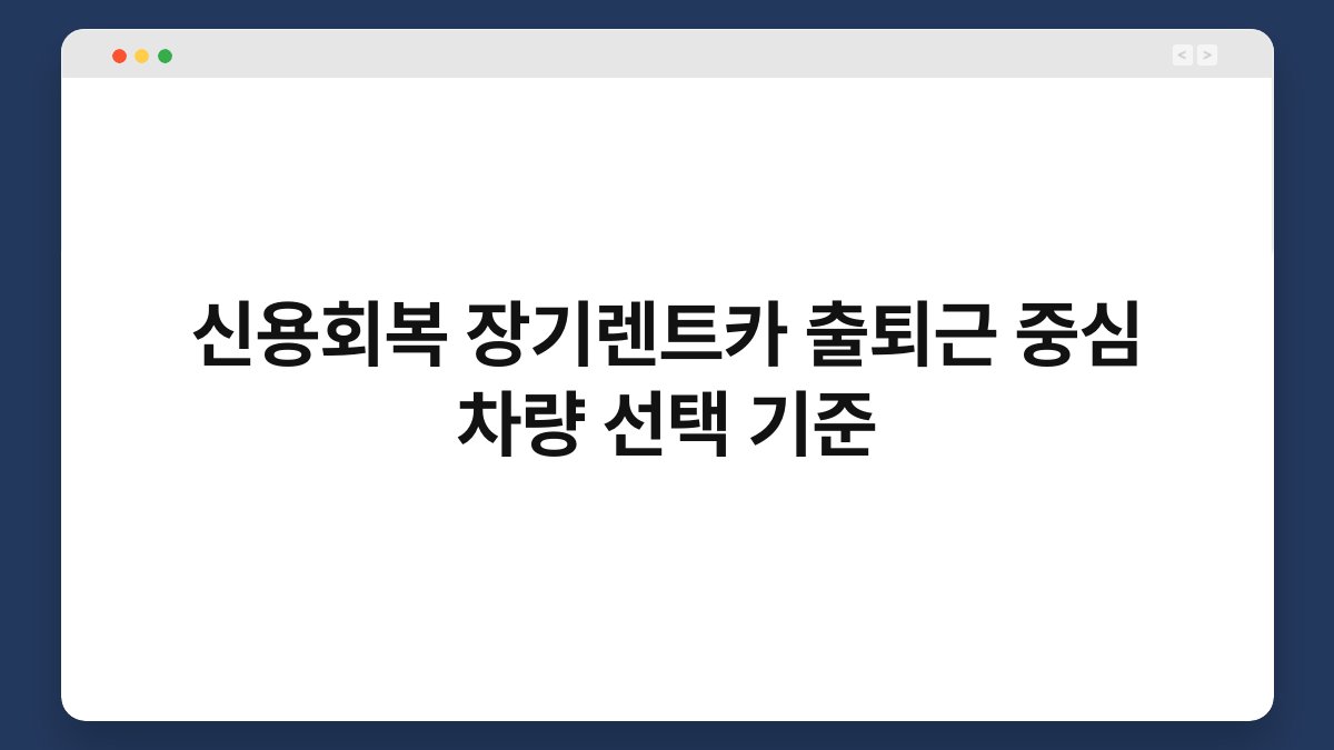 출퇴근을 위한 차량 선택, 고민이 많으시죠? 특히 신용회복 중이신 분들은 더욱 신중해야 할 필요가 있습니다. 장기렌트카는 이러한 상황에서 유용한 대안이 될 수 있는데요, 어떤 기준으로 차량을 선택해야 할지 함께 알아보겠습니다. 황제오토플랜과 함께라면 신용 문제를 걱정하지 않고도 적합한 차량을 찾을 수 있습니다. 지금부터 출퇴근 중심의 차량 선택 기준을 살펴보겠습니다.