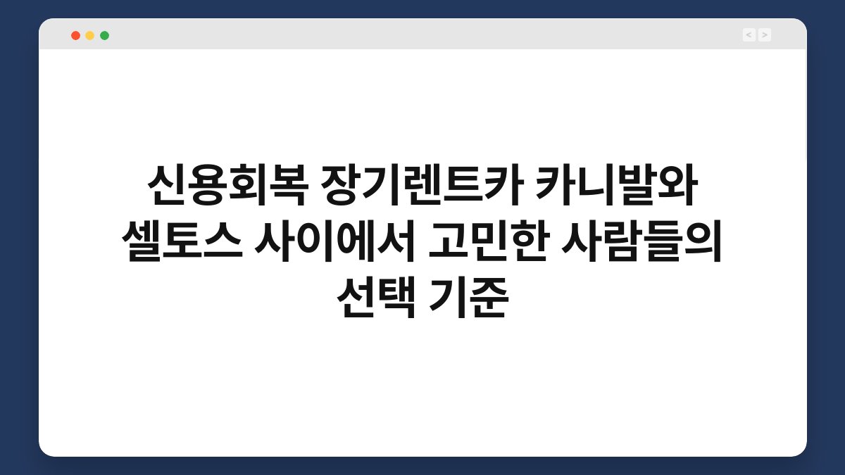 신용회복을 위한 장기렌트카 선택, 고민이 많으시죠? 카니발과 셀토스, 두 차량은 각각의 매력을 가지고 있어 선택이 쉽지 않을 것입니다. 이 글에서는 두 차량의 특징과 장단점을 비교하고, 신용회복을 위한 장기렌트카 선택 기준을 제시합니다. 또한, 황제오토플랜의 장기렌트 서비스가 어떻게 도움이 되는지도 함께 살펴보겠습니다.