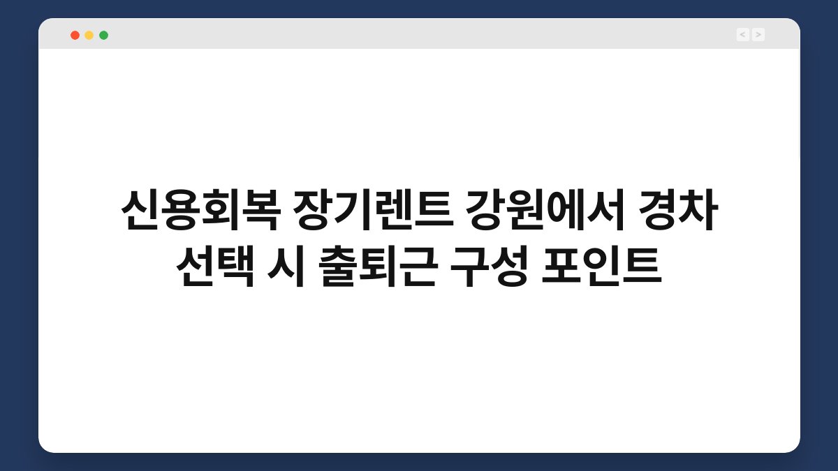 출퇴근을 위해 차량을 선택하는 것은 쉽지 않은 결정입니다. 특히 강원 지역에서 신용회복을 고려하는 분들에게는 더더욱 그렇죠. 경차는 경제적이면서도 실용적인 선택이 될 수 있습니다. 이 글에서는 장기렌트 방식으로 경차를 선택할 때 유의해야 할 포인트를 살펴보겠습니다. 황제오토플랜과 함께라면 더 나은 선택이 가능하답니다.